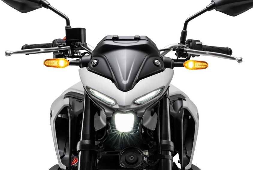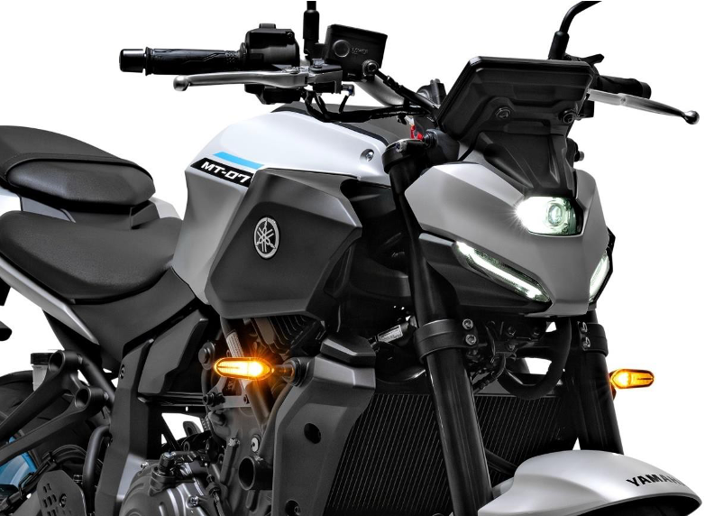 A Yamaha MT-07 Connected é uma motocicleta divertida de pilotar e a equipe de design procurou transmitir isso no visual do modelo. Na dianteira, o caráter é definido pelo farol, com as luzes de rodagem diurna (DRL) de LED compactas estilizadas propositalmente para se assemelharem a dois olhos fixos e conferirem à MT-07 um “rosto” distinto, agressivo e sombrio, em conjunto com o potente projetor de LED central e com as novas setas de LED.